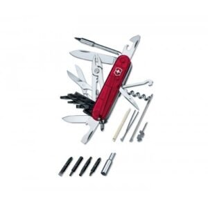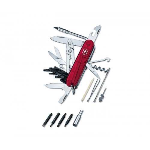 Victorinox Cybertool 1.7725.T – мультифункциональный, высококачественный, швейцарский универсальный нож. Содержит 25 разнообразных инструментов, исполняющих 35 функций. «Swiss Champ. Cyber Tools» оснащён необходимыми стандартными инструментами, которые замечательно подойдут в ежедневном использовании как для мужчин, так и женщин. Безусловно, что в быту каждого порадует открывалка для бутылок, консервный нож, штопор и другие инструменты. Дополнительно складной нож имеет держатель бит, булавку и плоскогубцы. Плюс, складной нож изготовлен исключительно из высококачественных материалов. Главный из них – нержавеющая сталь. Отдельно стоит отметить и красивую полупрозрачную ярко-красную рукоятку, которая не только радует каждый взор, но и в отличии от других моделей позволяет легко выбрать нужный инструмент.