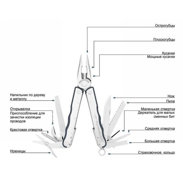 Додаткові функції | плоскогубці , викрутка , кусачки , ніж , консервний ніж , лінійка , напилок , ножиці , пила по дереву , бітотримач , гострогубці , для зачистки дротів , відкривачка для пляшок |