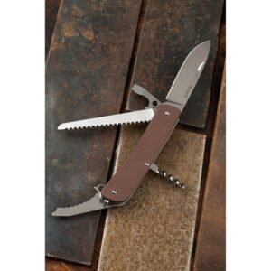 Рукоятка цього складного ножа порожня всередині, щоб там могли зберігатися всі робочі інструменти. Зовні вона прикрашена двома накладками з G10. Цей композит широко використовується в ножовий промисловості, оскільки він дуже вдало поєднує малу вагу з високою міцністю. На сонці такий матеріал не вигорає, а не вбирає воду. До того ж, він досить легко обробляється, щоб виробники могли надати рукоятці зручну форму. Рельєфна дрібна накатка на накладках не дає ножу ковзати в руках. Що стосується кольору, то покупцям доступно відразу три варіанти: чорний, зелений та коричневий.