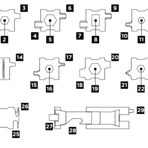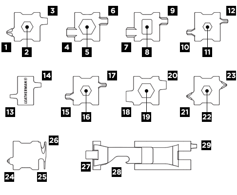 До» складу ” Leatherman Tread входять викрутки з хрестовим і прямим наконечниками, шестигранники, викрутка Phillips, накидний ключ, інструмент для розбивання скла, різак, інструмент для вилучення SIM-карт і навіть вбудована відкривачка для пляшок.