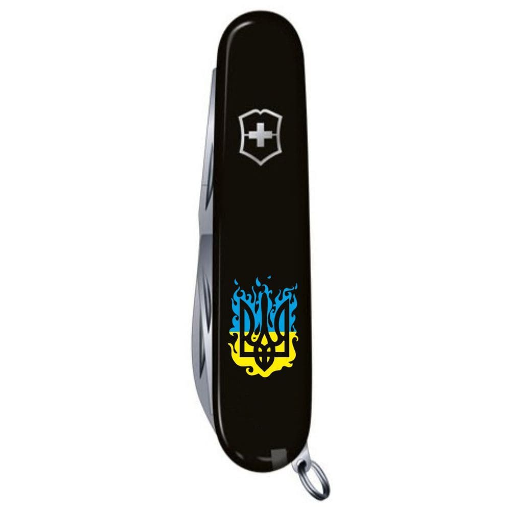 Швейцарський кишеньковий ніж 91 мм на 14 функцій з ексклюзивної лінійки CLIMBER UKRAINE для волелюбних та гордих українців. Чорні глянцеві накладки доповнені Тризубом із жовто-синіми язиками полум’я. Крута основа для друку – чорні накладки, які були автентичними для перших складаних ножів Victorinox. Практичний набір інструментів у кишеньковому форматі офіцерського складаного ножа. Модель Climber оснащена відмінними ножицями з пружинним механізмом та двома лезами різної довжини. Комбіновані інструменти поєднують відкривалки для пляшок та консервів із плоскими викрутками різного розміру на кінці. Багатозадачний гачок, штопор та шило з вушком для шиття. Звичний набір із пінцету та пластикової зубочистки в торцях накладок. Сталеве кільце, щоб комфортно прикріпити ніж до ланцюжка або темляка. моделі Climber Ukraine [1.3703.3_T0316u]: