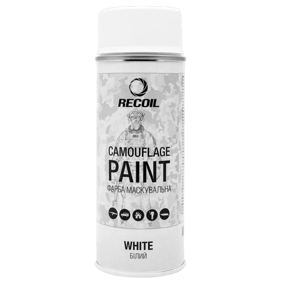 Фарба маскувальна аерозольна RecOil. Колір – білий матовий. Об’єм – 400 мл