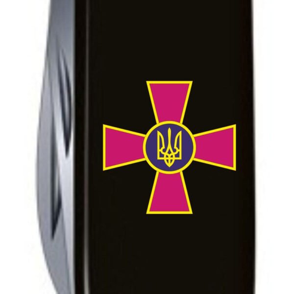 Швейцарський армійський ніж HUNTSMAN 91 мм із колекції Victorinox UKRAINE. Стійкий до стирання ультрафіолетовий друк на лицьовій накладці – емблема Збройних сил України. Відмінний тандем, адже саме чорні накладки були автентичними для перших ножів кишенькових Victorinox.