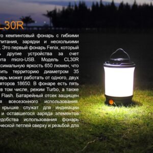 Серія кемпінгових ліхтарів Fenix продовжує поповнюватися новими моделями. Цього разу увазі покупців пропонується ліхтар Fenix CL30R. Він яскравіше за своїх попередників, а крім того, пропонує безліч додаткових переваг. Особливість кемпінгового ліхтаря полягає в тому, що він висвітлює не вузьконаправлений ділянку простору, а всю територію в діаметрі 35 метрів від ліхтаря. Тому ця модель підійде для висвітлення загальної території в наметовому таборі. А враховуючи, що ліхтар підтримує цілих шість режимів, його також зручно буде використовувати і для освітлення усередині намету. Ця модель підійде мандрівникам, рибалкам і мисливцям, а також буде корисна під час пікніків на природі з ночівлею.