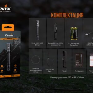 Ліхтар моделі Fenix LD22 V2.0, акумуляторна батарея Fenix ARB-L14-1100u, дві батарейки Pairdeer AA, кабель для зарядки USB Type-C, темляк, чохол, запасне кільце ущільнювача, керівництво до застосування, талон гарантії.