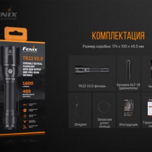 Комплектація: ліхтар Fenix TK22 V2.0, кліпса, ремінець на руку, чохол (з регульованою довжиною), запасне кільце, перехідник ALF-18, інструкція, гарантійний талон.