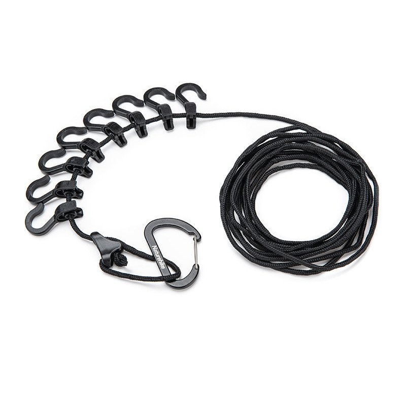 Мотузка призначена для підвішування різних дрібних предметів, які можуть вам стати в нагоді під час перебування на природі. У складі виробу – такі матеріали, як поліестер, нейлон, сплав алюмінію. Колір-темно-сірий. Довжина досягає 430 сантиметрів. На мотузці, наприклад, можна зафіксувати всілякі кухонні прилади, посуд, чашки. На мотузку кріпляться гачки, які дозволяють підвішувати необхідні речі. Довжина виробу регулюється.