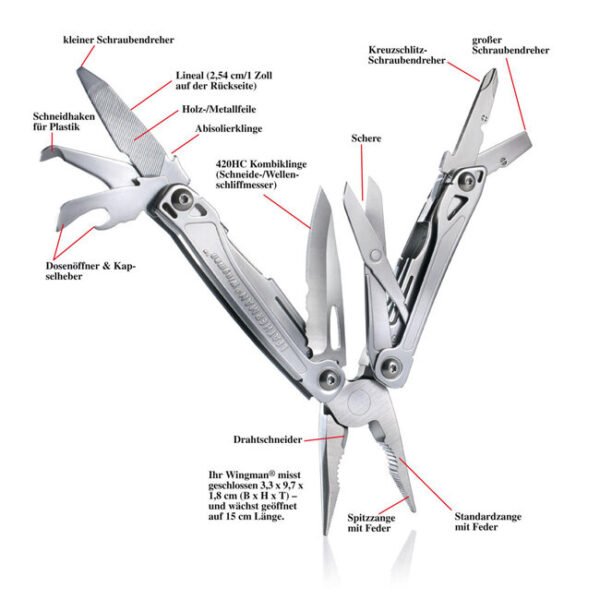 Додаткові функції | плоскогубці , викрутка , кусачки , ніж , консервний ніж , лінійка , напилок , ножиці , гострогубці , для зачистки дротів , відкривачка для пляшок |