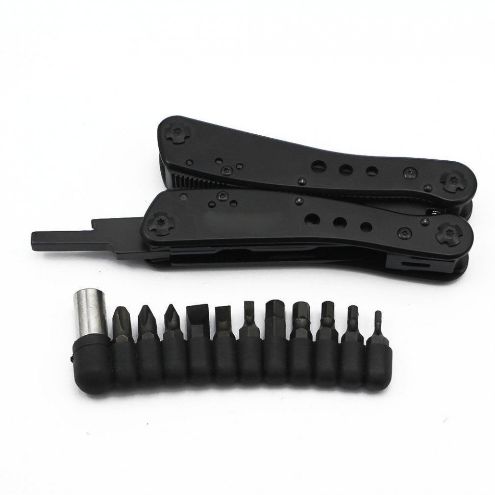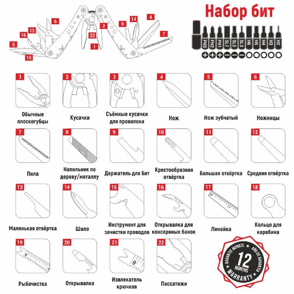 | Кількість функцій | плоскогубці, кусачки, маленька викрутка плоска, ніж, серрейтор, консервний ніж, відкривачка для пляшок, для зняття ізоляції, пила, захоплення для гайок і циліндрів, ножиці, шило, тримач біт, 12 змінних насадок в комплекті |