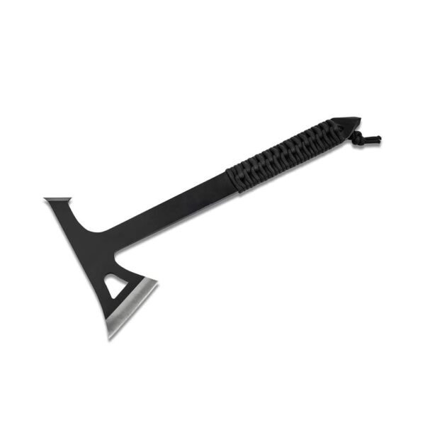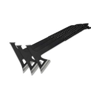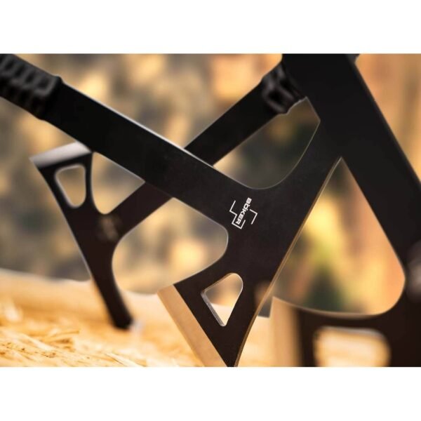 Ці красені мають суцільну конструкцію, виготовлені зі сталі 3Cr13 (48-54 HRC) та мають загальну довжину 278 мм. Чорне покриття захищає сокиру від корозії, а також надає їм більш агресивного вигляду.