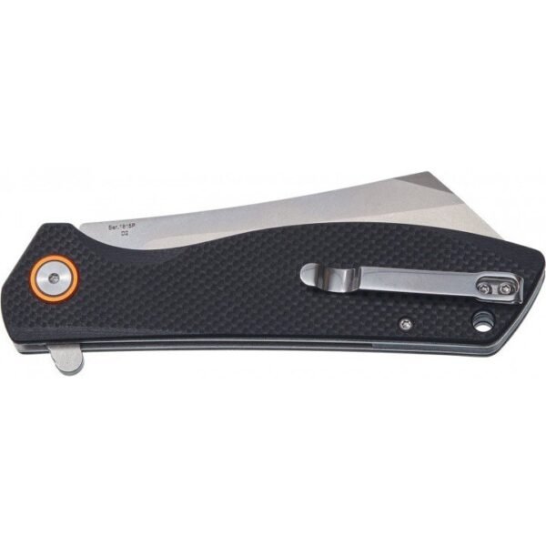 Клинок форми “Sheepfoot” виготовлений з високоякісної сталі D2, яка тривалий час тримає заточку. Наявність фліппера дозволяє швидко витягувати клинок однією рукою. Метод обробки клинка stonewash.