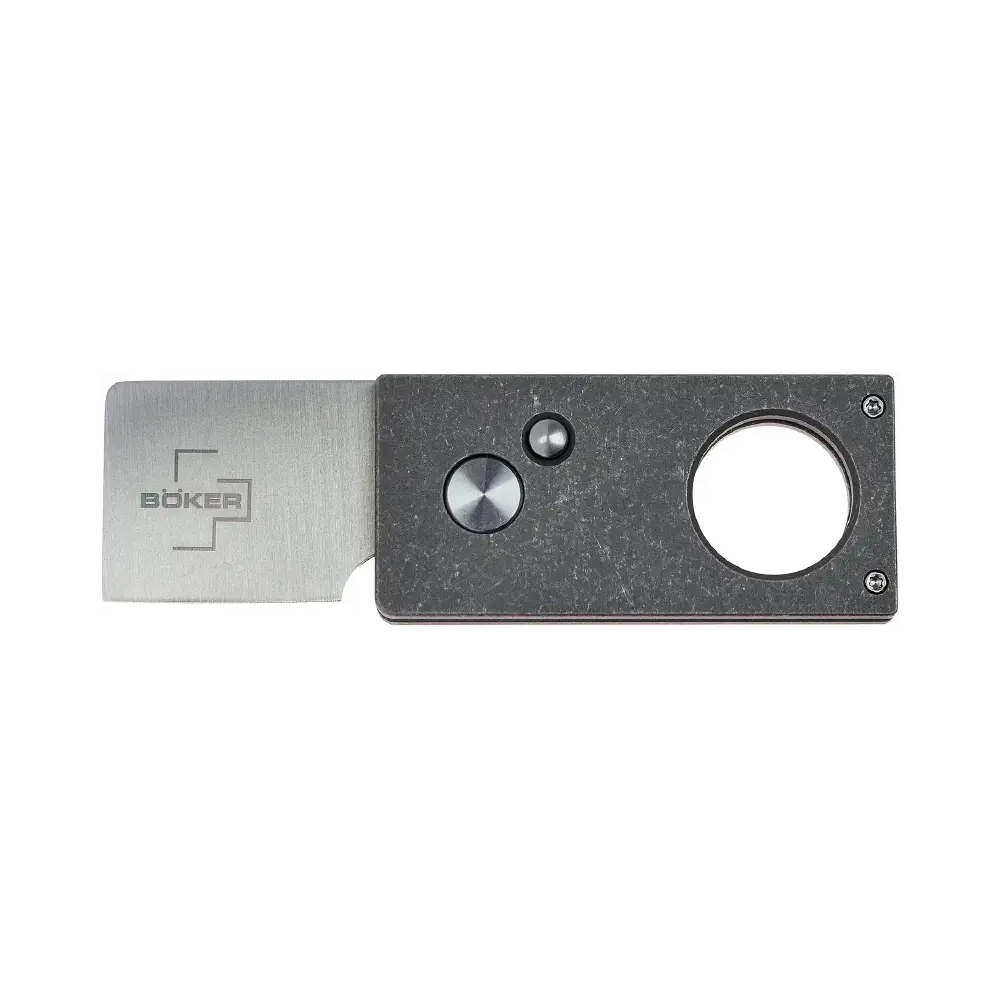 Хороша сигара, склянка міцного бренді та розмови про все на світі у колі товаришів були і будуть одним із найпопулярніших видів дозвілля. Правильне та чітке обрізання головки сигари є не тільки запорукою правильного використання та отримання максимум смаку, але вже стало своєрідною церемонією. Для цього потрібен надійний інструмент – Boker Plus Cigar Cutter – класична гільйотина для сигар. Клинок виготовлений із нержавіючої сталі 440С із сатиновим фінішем. Приводиться в робоче положення двома способами: при натисканні на кнопку спереду, клинок відкриється під кутом 45 °, відкриваючи отвір для вставки сигари, а якщо натиснути кнопку позаду – ніж відкриється повністю. Рукоятка виконана повністю з титану з обробкою Stonewash.