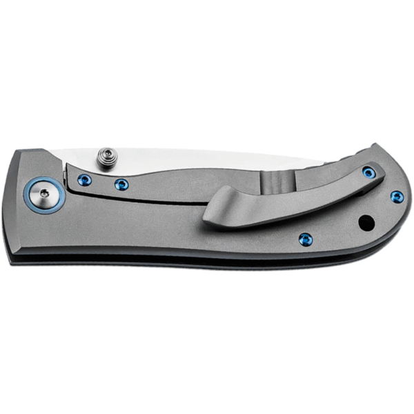 Найвизначнішою родзинкою даного ножа є його двокомпонентна накладка руків’я. Передня частина накладки виконана з матеріалу FAT Carbon та має неповторний візерунок «Чорні дюни», в той час, як задня частина виготовлена з вуглецевого волокна та має неперевершену текстуру «Космічний корал». Осьове кільце та гвинти, виготовлені з титану з анодуванням синього кольору, додають яскравих акцентів та гармонійно доповнюють дизайн. Boker Plus Collection 2024 оснащений стильною кишеньковою кліпсою, яка виточена з суцільного шматка титану. На торці руків’я розташований отвір під темляк чи ремінець.