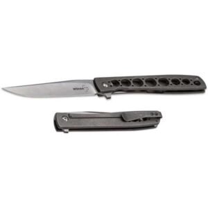 Сатинований клинок виготовлений з японської високохромистої сталі VG-10, легко витягується завдяки системі шарикопідшипників за допомогою плавця (фліппера) і надійно фіксується замком фреймлок. Накладки рукояті виконані з титанового сплаву. Відчини в рукояті не тільки служать декоративним елементом, але і додатково полегшують вагу ножа. Для більш комфортного носіння передбачена кишенькова кліпса.