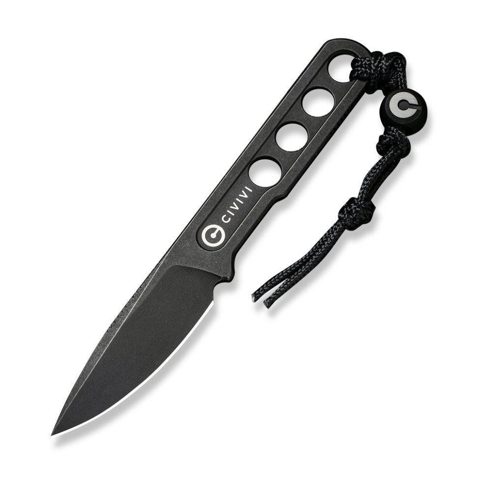 Чотири наскрізні отвори в скелетонізованій конструкції знижують вагу інструмента до 28.7 грамів, і це з урахуванням фірмового темляка з титановою бусиною, на якій видно логотип бренду. До комплекту також включений сталевий ланцюжок на шию та чорні піхви з термопластику марки Kydex, що забезпечують жорстку фіксацію ножа. У піхвах передбачено один отвір для зливу води, а також кишеньковий затискач, виготовлений з нержавіючої сталі.