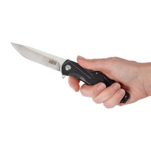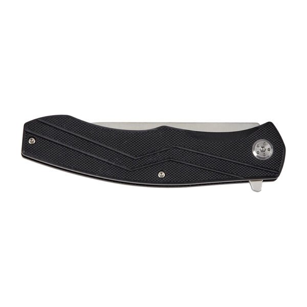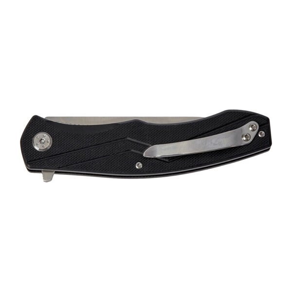 Клинок профілю Drop Point виконаний із недорогої сталі марки 3Cr13, яка відрізняється хорошими показниками корозійної стійкості, а також простотою виправлення різальної кромки. Вилучається клинок за допомогою фліпера і надійно фіксується у робочому положенні сталевою пластиною замка Liner Lock. Ніж обладнаний системою шарикопідшипників, що сприяє легкому та плавному витягуванню клинка. Увігнуті спуски починаються з 1/3 від обуха, що у поєднанні з формою клинка забезпечує ножу хороші колючі та різальні якості.