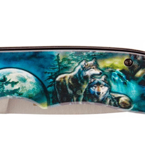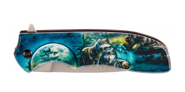 Рукоять зручної форми, прекрасно лежить в руці, має накладки з алюмінію з чорним покриттям, на одній з яких кольорове зображення пари вовків на тлі повного місяця і лісового водоспаду. У складеному вигляді ніж носиться в положенні tip-down на односторонній кліпсі.