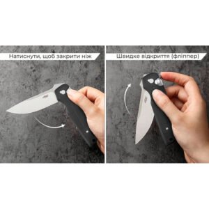 Конструкція відкривається одним рухом — натисканням на сталевий фліпер. Для закриття призначена кнопка замка Button Lock, одне натискання на яку звільняє клинок і дозволяє сховати його в руківʼї.