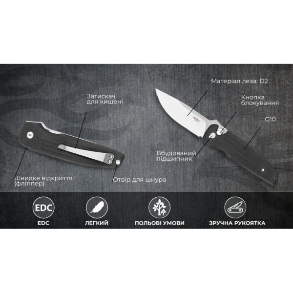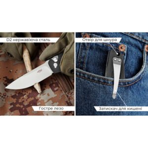 - матеріал клинка – нержавіюча сталь D2 (твердість ±60 HRC);