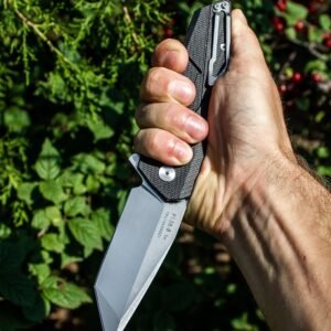 Для максимального комфорту експлуатації на рукоять ножа були встановлені накладки з G10, які по міцності прирівнюються до металу і при цьому набагато легше за нього, а за рахунок шорсткої поверхні ще і більш приємні на дотик, і, не ковзають в долоні.