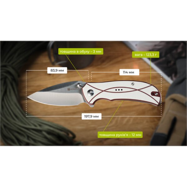 По обидва боки руківʼя закріплені рельєфні накладки зі склопластику G10, який відповідає за міцний хват. Матеріал не вбирає вологу та запахи, не тріскається при ударі та перепадах температури, тому інструмент можна використовувати за будь-яких умов, де потрібен надійний та довговічний помічник.