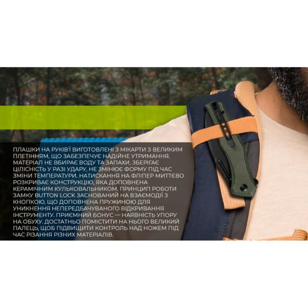 Натискання на фліпер миттєво розкриває конструкцію, яка доповнена керамічним кульковальником. Принцип роботи замку button lock заснований на взаємодії з кнопкою, що доповнена пружиною для уникнення непередбачуваного відкривання інструменту. Приємний бонус — наявність упору на обуху. Достатньо помістити на нього великий палець, щоб підвищити контроль над ножем під час різання різних матеріалів.