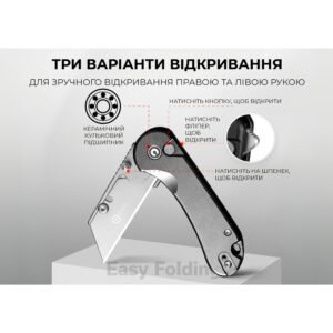 Ніж оснащений канцелярським ножем замість класичного клинка, тому стане в пригоді не тільки для вирішення повсякденних завдань, а й для професійної діяльності. Тонке лезо акуратно й точно ріже картон, мотузки, вироби зі шкіри, пластику та гуми. У наборі є 3 змінні клинки ідентичної форми. Всі вони виготовлені з нержавіючої сталі 6Cr, обробленої методом галтування для усунення блиску металу.