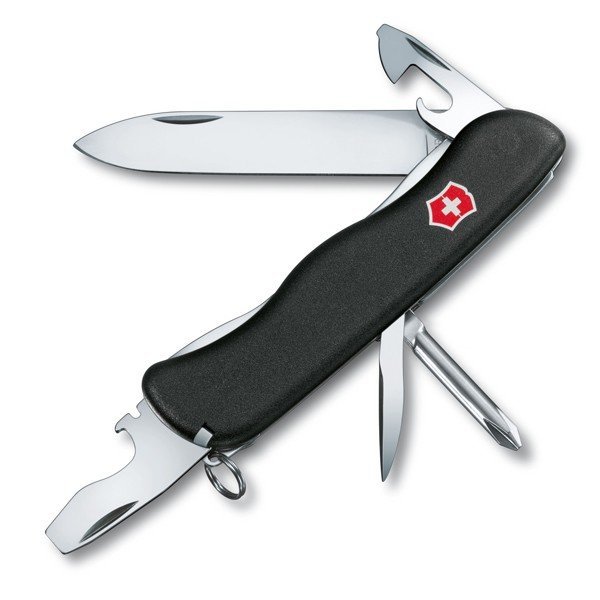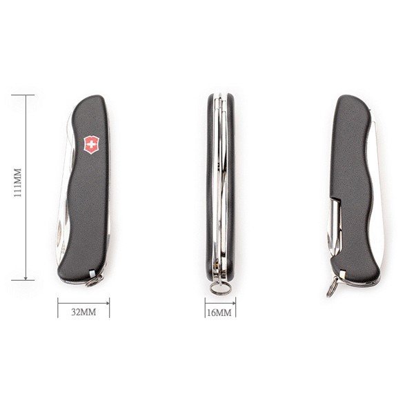 Лезо фіксується у відкритому положенні замком типу лайнер-лок, а накладки на рукояті виключають ковзання в руці . Крім того, ніж Victorinox дуже практичний і містить всі основні інструменти для повсякденного життя. Ніж виготовлений з високоякісної нержавіючої сталі. Рукоять виконана з чорного матового нейлону. Розмір – 111мм. Вага – 125г.