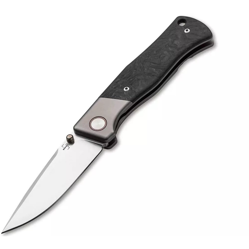 Клинок універсальної форми Drop point виготовлений з високоміцної порошкової сталі М390. Завдяки системі кулькових підшипників клинок легко витягується і надійно фіксується замком Замок Рами. Шпенек і кільце навколо осьового гвинта анодовані бронзою і доповнюють загальний дизайн ножа.