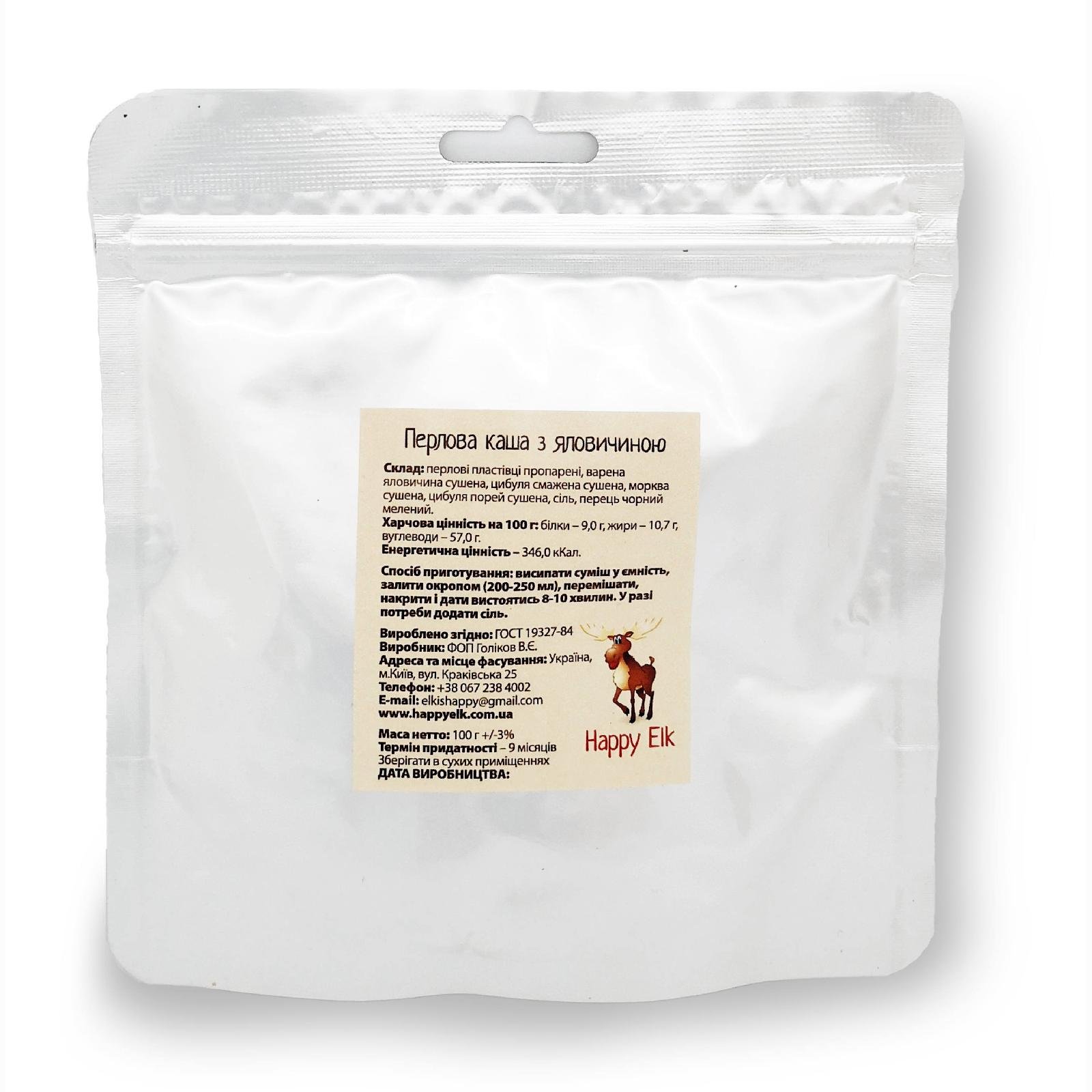 Опис перлової каші з телятиною Happy Elk (упаковка для запарювання) AM0007: