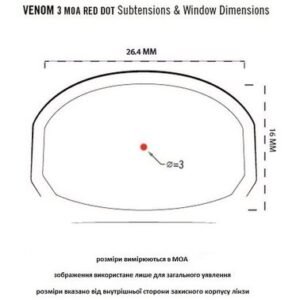 Об’єкт має повне багатошарове просвітлення, він забезпечує чітке зображення від краю до краю, і має необмежену поле зору і видалення вихідної зіниці. Приціл надає вибір між автоматичним і ручним налаштуванням яскравості, забезпечуючи тривалість роботи до 30 000 годин на одному комплекті батарей в мінімальному режимі яскравості. Кришка відсіку батареї розміщена зверху, що дуже зручно, так як дозволяє не демонтувати пристріляний приціл зі зброї для заміни батареї. Діаметр прицільної точки становить всього 3 MOA, завдяки чому не перекриваються дрібні і середні цілі при веденні стрільби на середніх дистанціях. Vortex Venom 3 MOA ( Weaver /Picatinny) – ідеальний приціл для того, щоб підняти точність і швидкість стрільби з пістолета, дробовика або автоматичної гвинтівки на новий рівень.