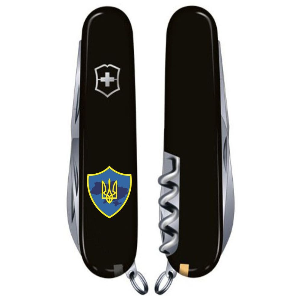Многофункціональний армійський ніж HUNTSMAN 91 мм (15 функцій) швейцарського виробництва з колекції Victorinox UKRAINE. Чорні накладки доповнені стійкою до стирання ультрафіолетовою печаткою символіки, зрозумілою та дорогою кожному українцю.
