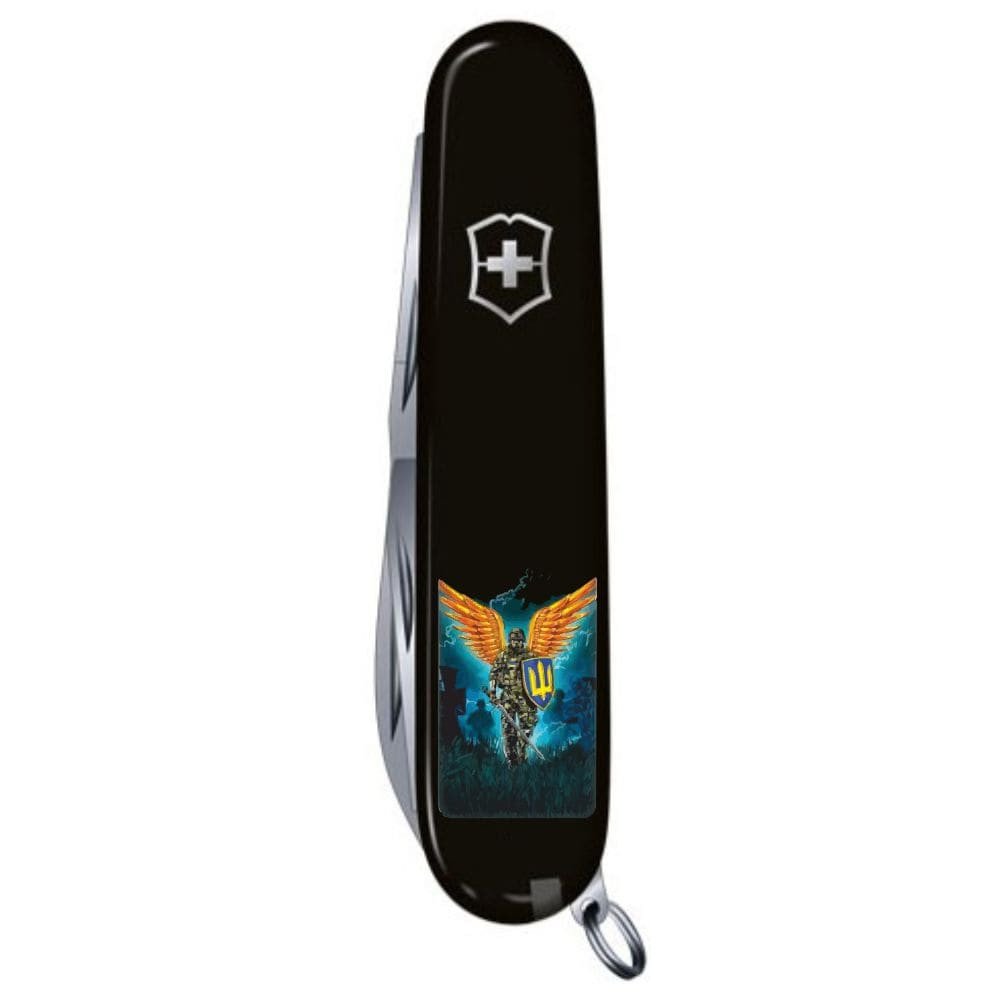 Культова модель складного кишенькового ножа SPARTAN 91 мм з патріотичної колекції UKRAINE. Чорні глянцеві накладки з якісним ультрафіолетовим друком – воїн-ангел Збройних сил України. Відмінний тандем, адже саме чорні накладки були автентичними для перших складних ножів Victorinox.