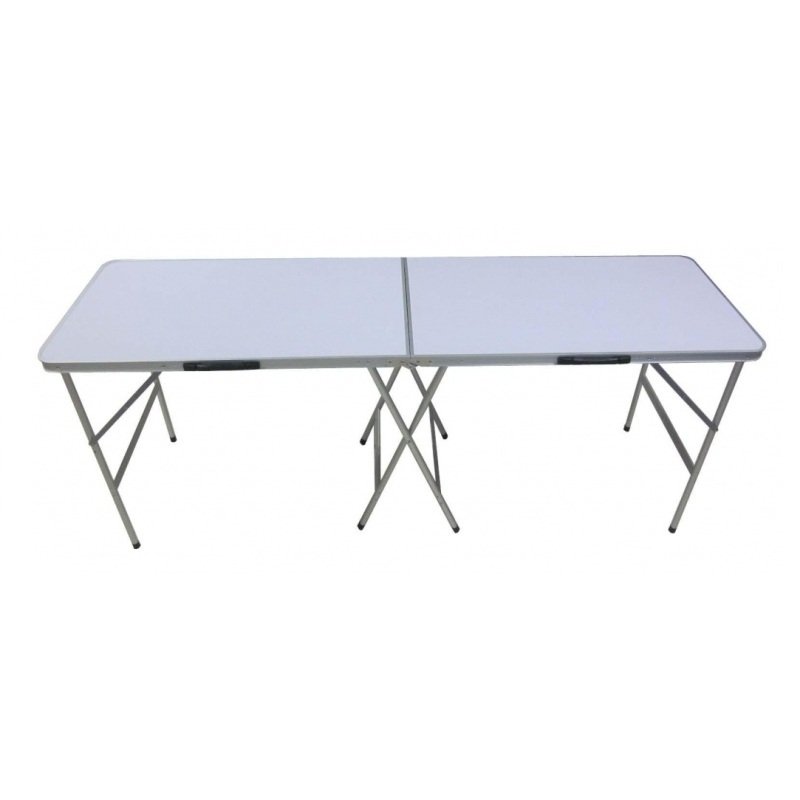 Виріб складається з двох стільниць, виконаних з МДФ панелей (товщина – 4,2 мм), загальною довжиною 198 см (ширина і висота – 60х78 см відповідно). Ніжки виконані з алюмінієвого профілю, діаметром 22 мм МДФ плити – прекрасний вибір для стільниць. Матеріал поєднує в собі цінову доступність, міцність і довговічність. Завдяки характеристикам панелей, стіл довго збереже зовнішній вигляд.