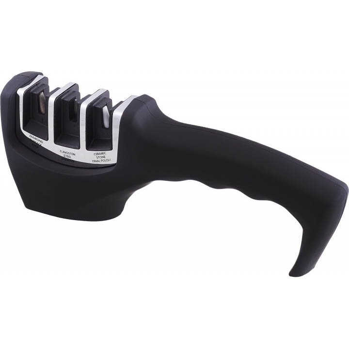 Настільні точила Risam призначені для заточування і шліфування ріжучої кромки кухонних ножів. Силіконові накладки на підставці перешкоджає ковзанню точила по гладкій поверхні. Три V-подібних слоти дозволяють заточувати ножі будь-якого розміру і з різним ступенем затуплення. Карбідний грубозернистий абразив призначений для базового заточування крайки. Алмазний абразив – для середнього заточування. Керамічний дрібнозернистий абразив дозволяє здійснити остаточне доведення. Зручна рукоятка забезпечує безпечне використання.