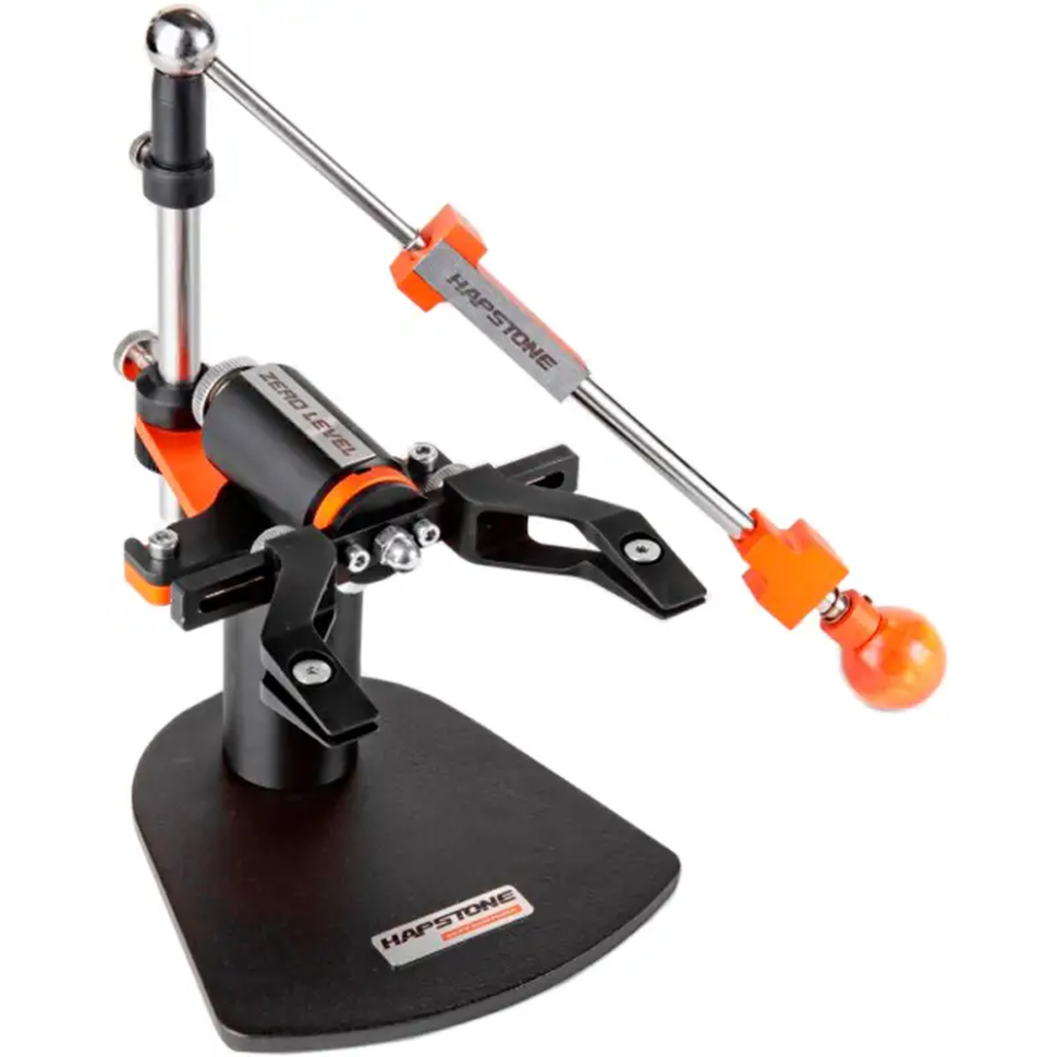 Точильні системи Hapstone розроблялися для того, щоб забезпечити максимально точне заточування різальної кромки будь-якого ножа, незалежно від його розмірів, довжини клинка та виду сталі. Основа системи масивна, сталева, ніжки доповнені гумовими накладками – таким чином пристрій не ковзає по столу під час робочого процесу. Легка горизонтальна штанга несе на собі універсальний тримач каменів та місце для монтажу цифрового кутоміра, керується вона зручною дерев’яною ручкою. Муфта точного коригування кута обертається дуже плавно. Шарнірний вузол оснащений лінійним підшипником, що мінімізує тертя та забезпечує рівне ковзання штанги. Є гачок для паркування.