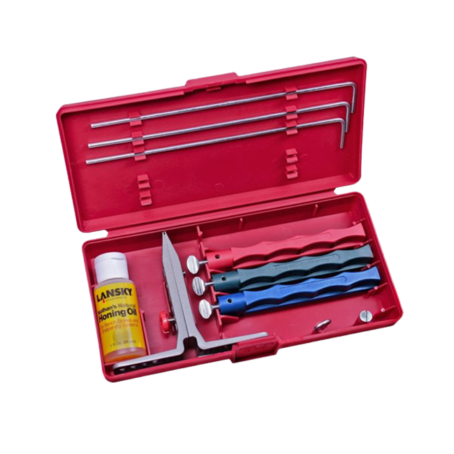 Набір складається з декількох точильних каменів, направляючих для них, затиску для ножа і пляшечки спеціального масла для точильних каменів. Затискач дозволяє закріпити ніж для заточки леза під різними кутами. Три входять в набір точильних каменю мають рукоятки різних кольорів, що позначають ступінь зернистості каменю. У цьому наборі три точильних каменю – крупнозернистий, для грубої правки і заточування, середньозернистий і дрібнозернистий. Спеціальне мастило для точильних каменів допомагає досягати кращої заточування, а, крім цього, воно сприяє меншому зносу точильного каменя. Набір акуратно розміщений у невеликому пластиковому кейсі.