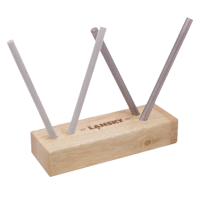 Одна або декілька пар отворів свердлити в дерев’яному бруску під різними кутами відносно один одного. Після цього пара точильних каменів може бути встановлена у відповідну пару отворів – і можна здійснювати заточку! Після закінчення роботи точильні камені можуть бути прибрані – брусок-основа має відсік для зберігання точильних каменів.